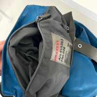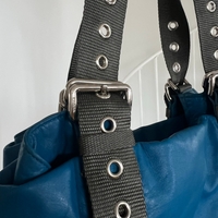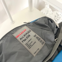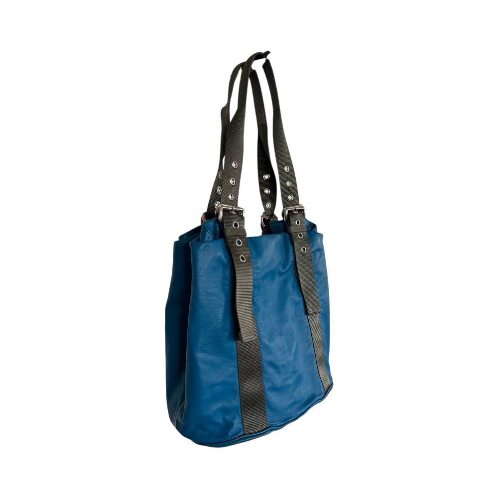 Prada ihana sininen vintage-laukku, 100% nahkaa. Khaki-väriset nailon-hihnat hopeisilla logo-merkityillä metalliosilla. Vetoketjullinen tasku sisällä. Siisti kunto, vähäistä käytönjälkeä. Aito tuote, Lampon vetoketjulla. Aitoutettu myös Vestiairen experteillä ja mukana tulee aitoutus-tagi. Mitat noin 30x40x20cm.