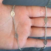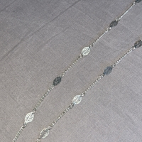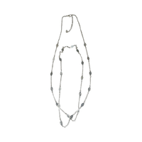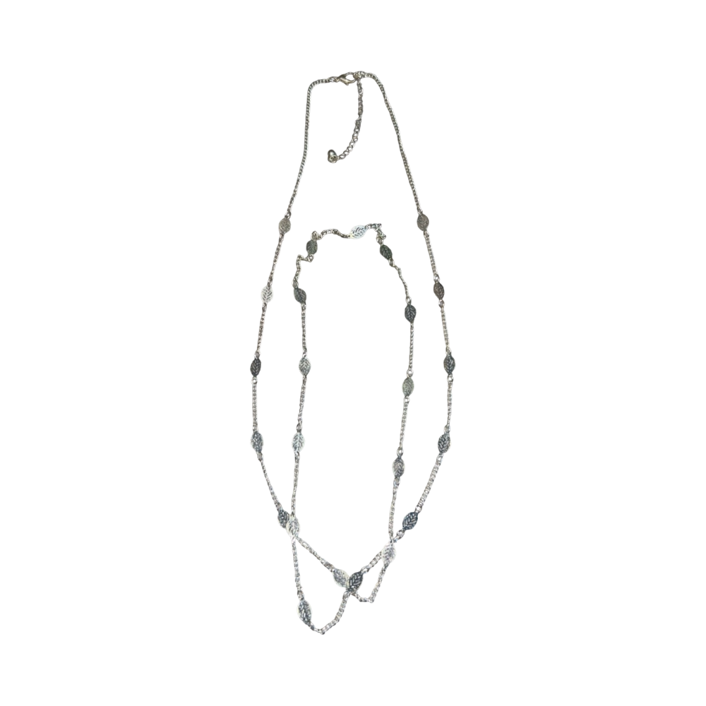 Pitkä hopeanvärinen kaulaketju, pienillä lehtikoristeilla.