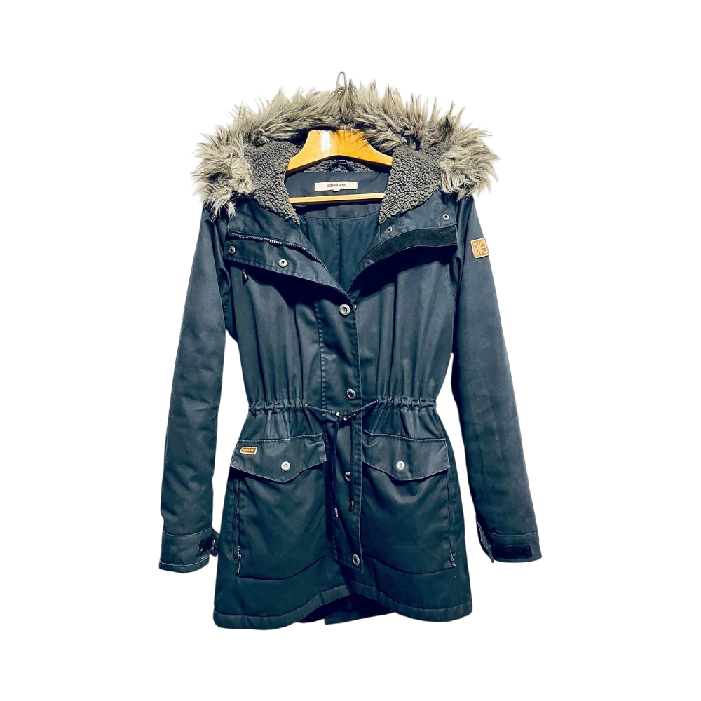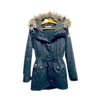 Super warm dark navy blue Makia winter parka with faux-fur hood trim