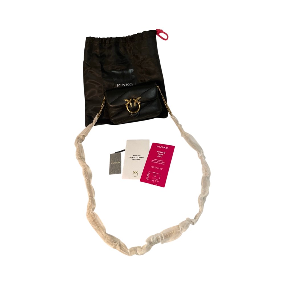 Uusi Pinko Love Puff Micro- olkalaukku, väri musta. Mitat näkyy kuvissa. Laukku on melko pieni, mutta tyylikäs. Mahtuu esim avaimet, kuulokkeet ja pieni korttikotelo tai lompakko, ja muuta pientä.