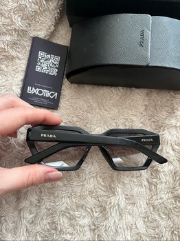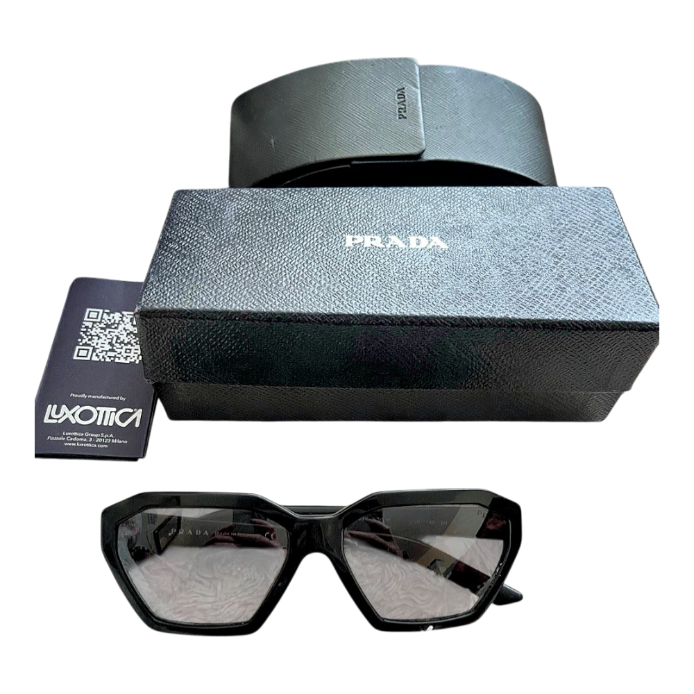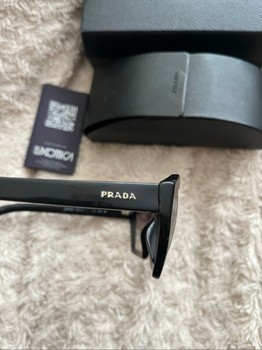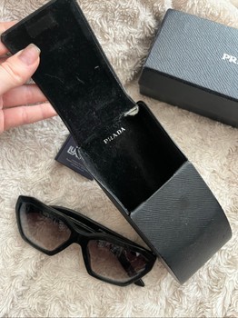 Mustat Prada aurinkolasit kotelolla, joka matkalaukussa lentokentällä ottanut osumaa. Linsseissä jonkin verran naarmuja. Vielä kuitenkin käyttöikää jäljellä vaikka vähän huolettomampaan käyttöön.