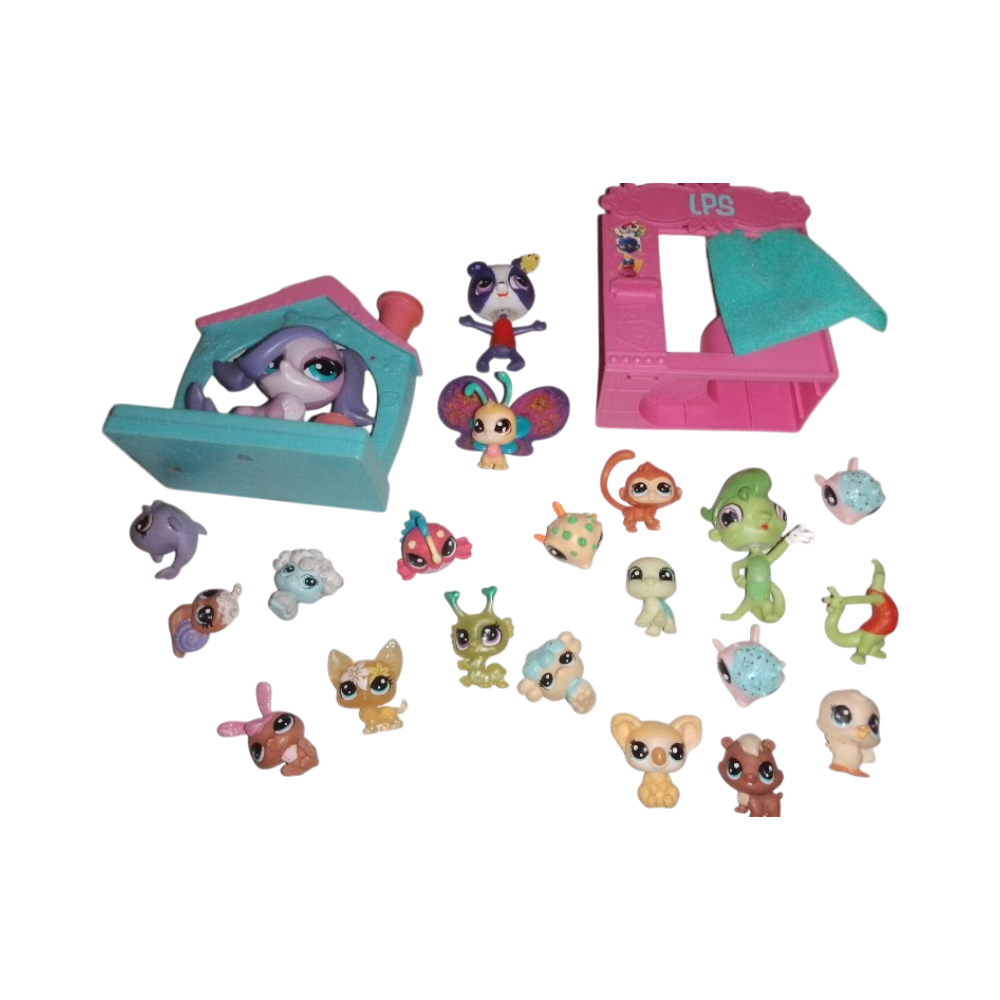 Assorted Littlest Pet Shop mini figures and small playsets.