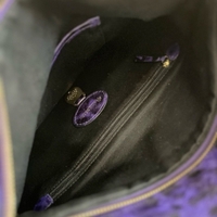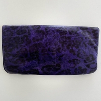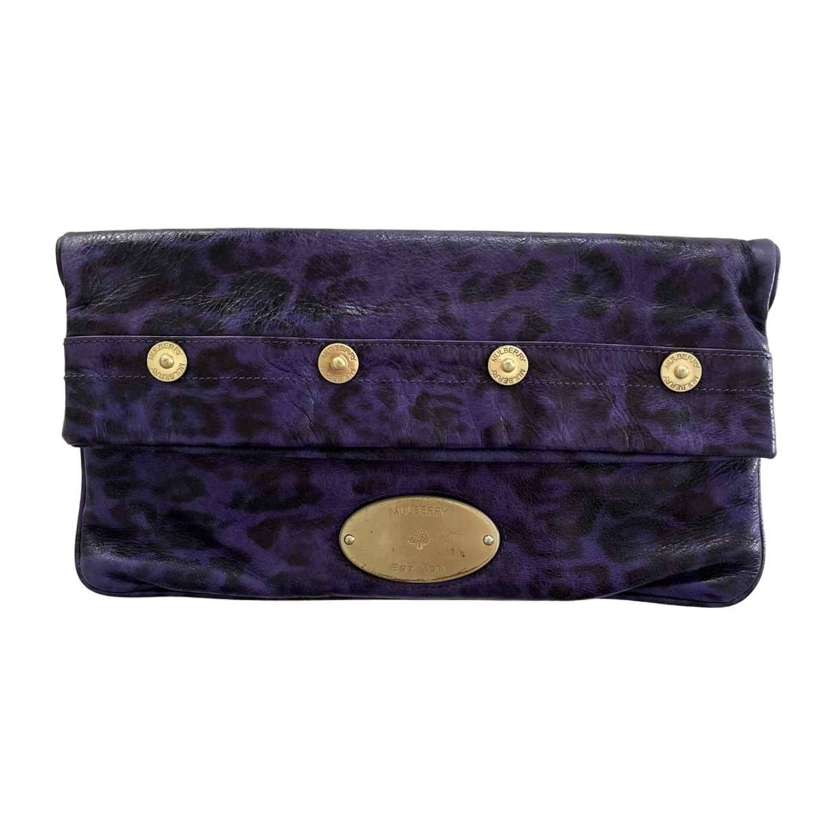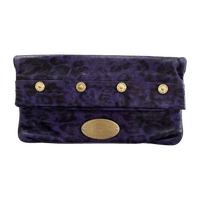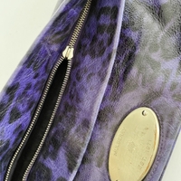 Mulberryn Mitzy clutch violetti-mustalla eläinprintillä. Ostettu Lontoosta v. 2011. Korkeus 18 cm (taitettuna) ja leveys 31 cm. Huom. vetoketjusta irronnut ”vedin” mutta saa silti avattua/suljettua. Metallilaatassa naarmuja, ks. viimeinen kuva. Dustbagia ei valitettavasti tallessa.