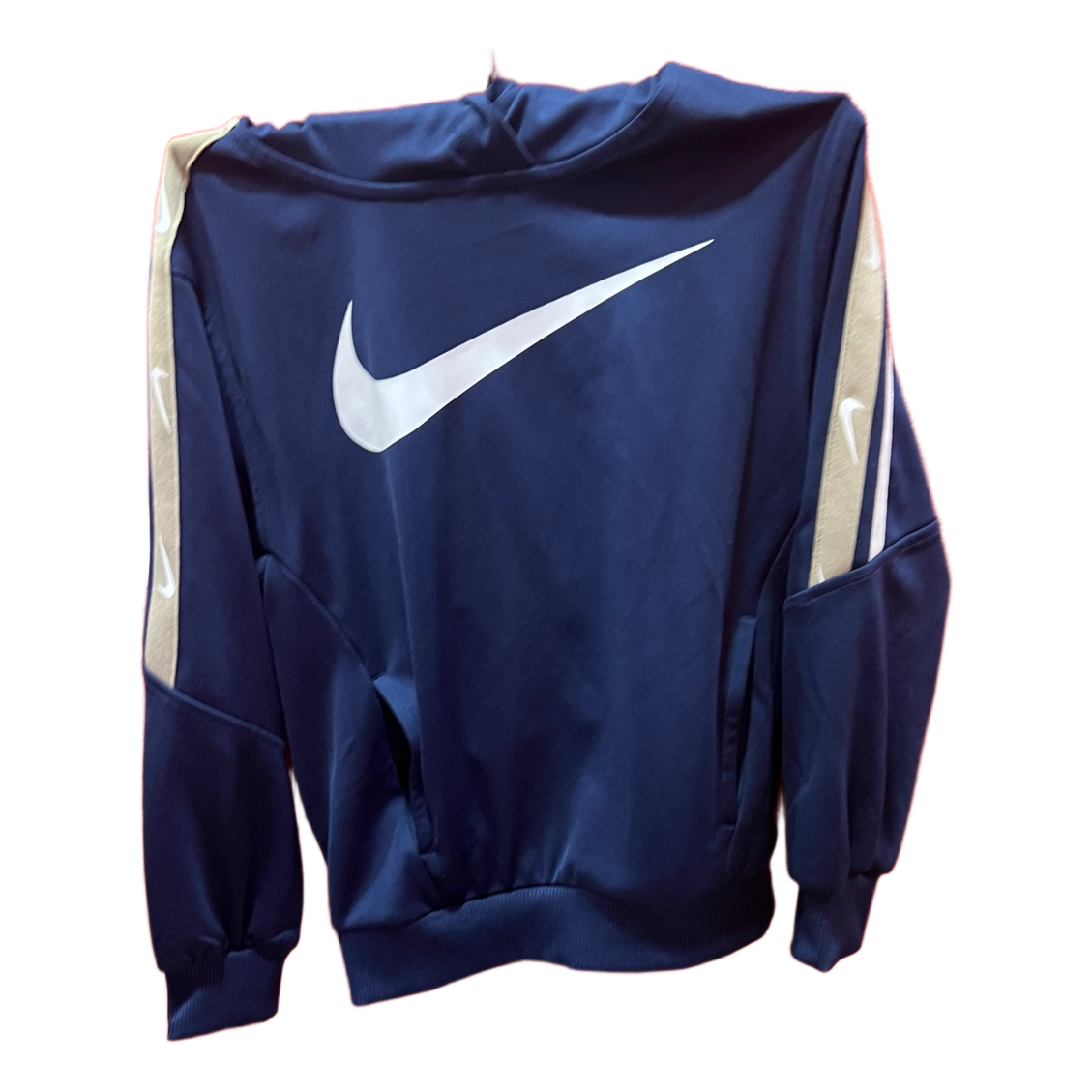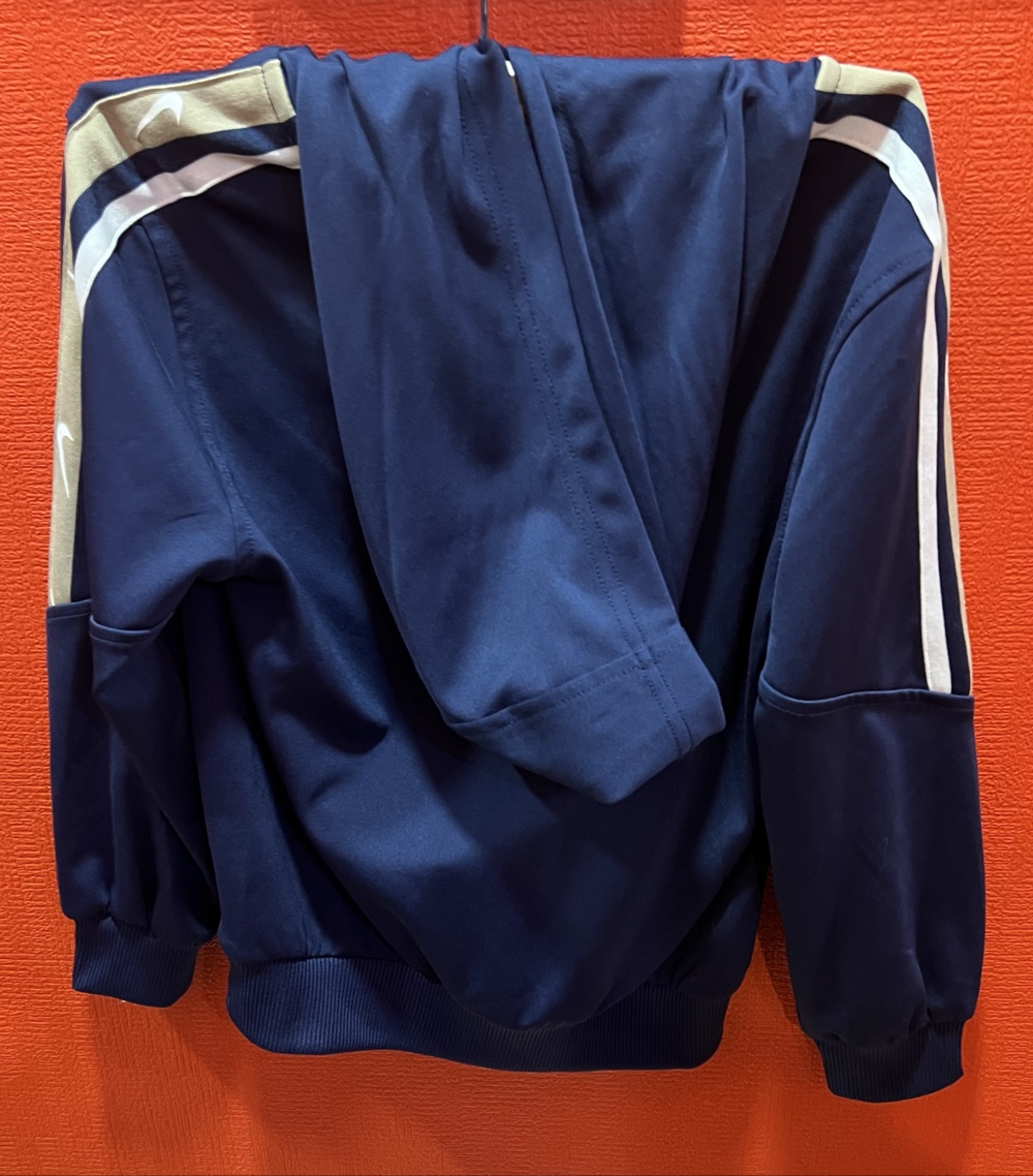 Zils Nike džemperis ar kapuci un baltu logo. Garas piedurknes ar svītrainu dizainu.Plana,122-128 cm