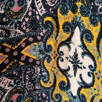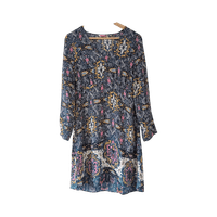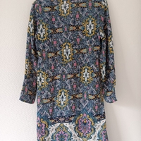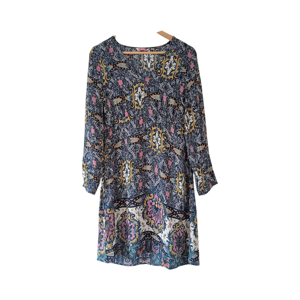 Värikäs kuviollinen mekko, pitkät hihat, rento malli. Erinomainen kunto. 100% viskoosia.