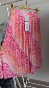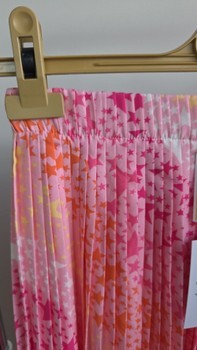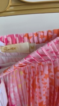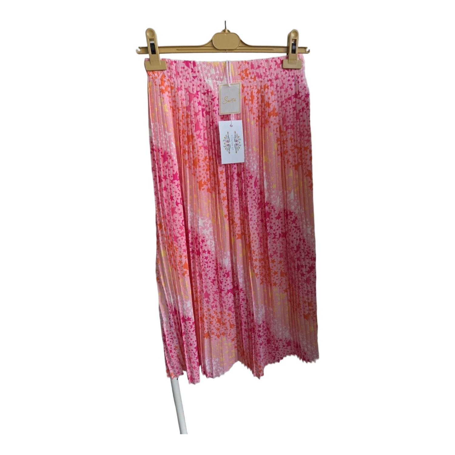 Pleated midi skirt in pink with a star pattern. Features an elastic waistband and brand tag. Made of 70% viscose and 30% polyester. Size M.