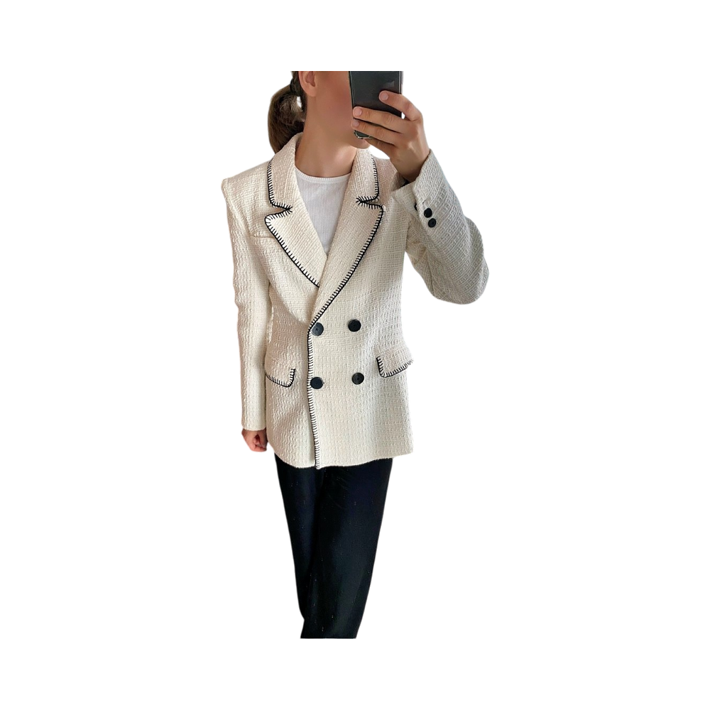 Kaksirivinen bleiseri mustalla reunakirjailulla, siisti ja hyväkuntoinen