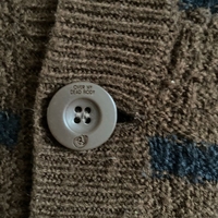 Also fits Women’s S–M (regular or slightly oversized). Thin, warm and stretchy textured knit in brown and black. 30% wool. Front logo buttons with the text “over my dead body”. Excellent condition.