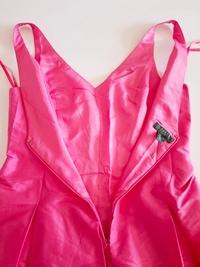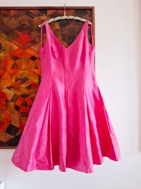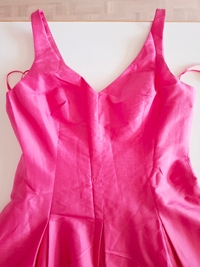 Pink sleeveless dress with fitted bodice and flared skirt.