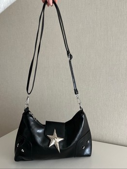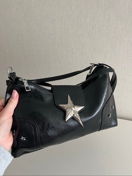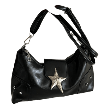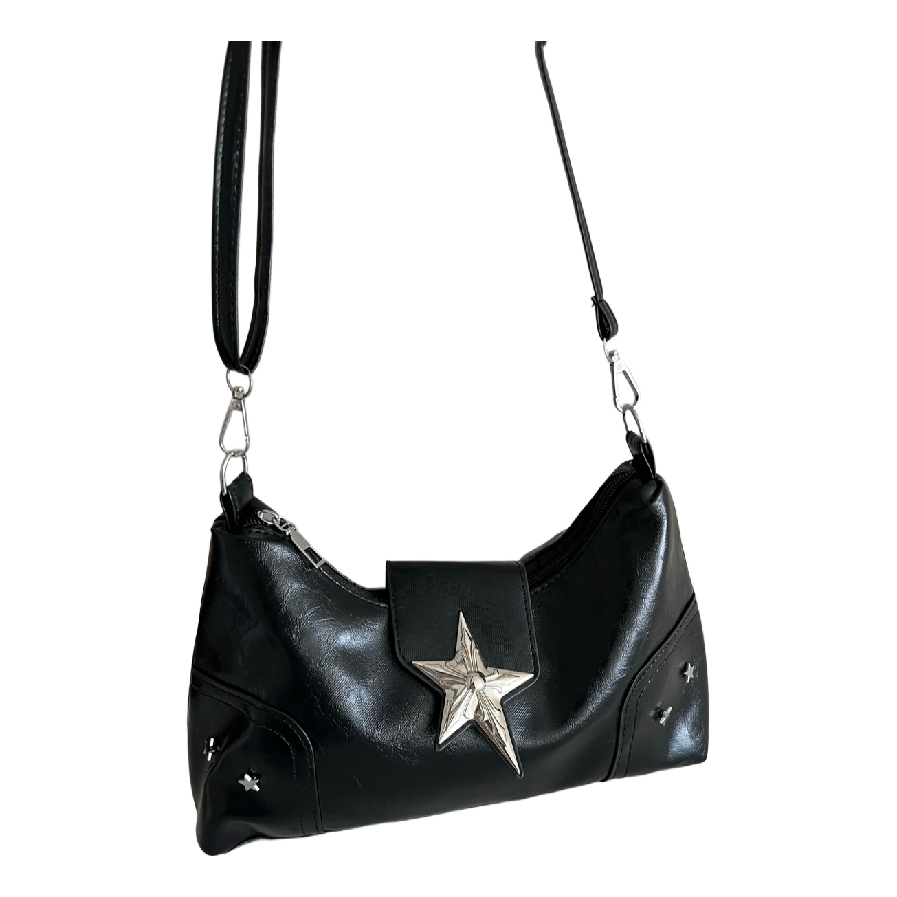 Black shoulder bag featuring a prominent silver-tone star detail on the front. Includes a detachable adjustable strap and zipper closure.