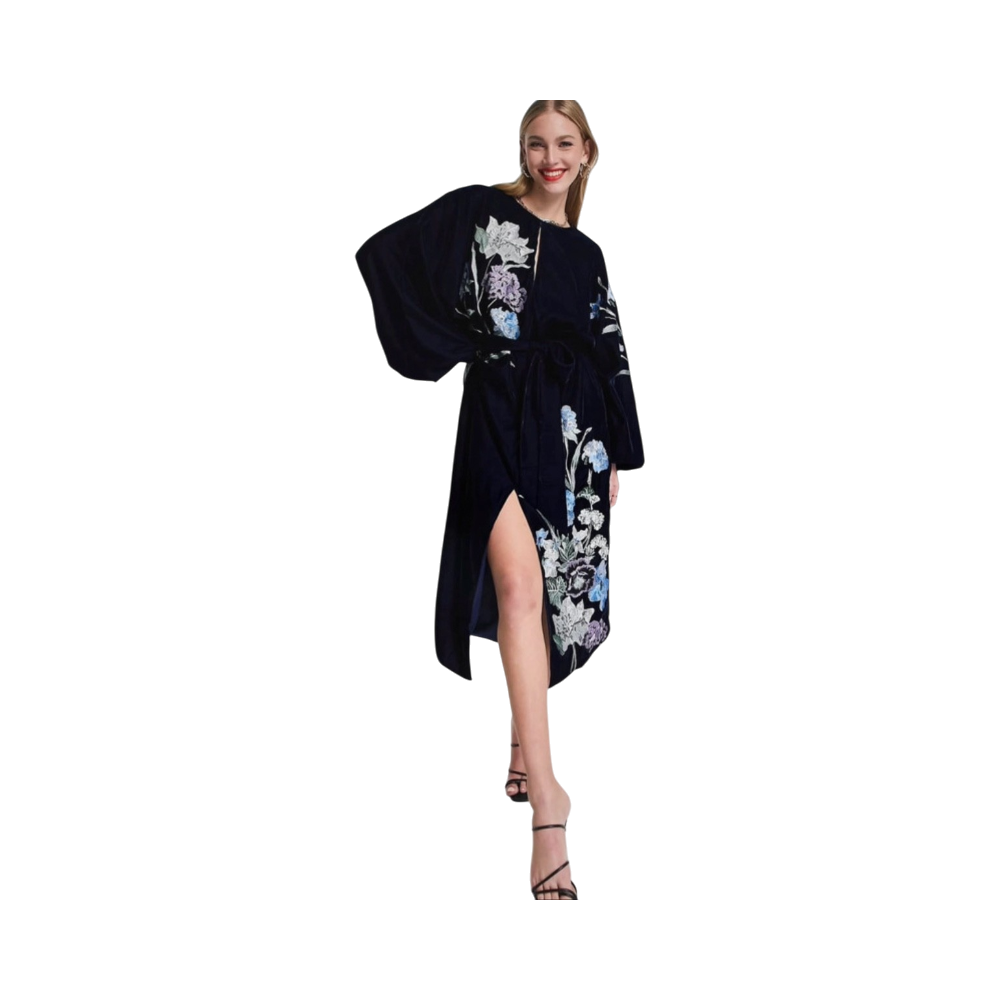kaunis tummansininen samettinen asos design midimekko kukkakirjailuilla✨