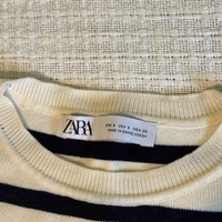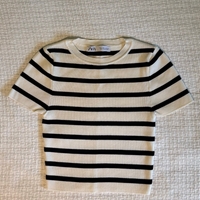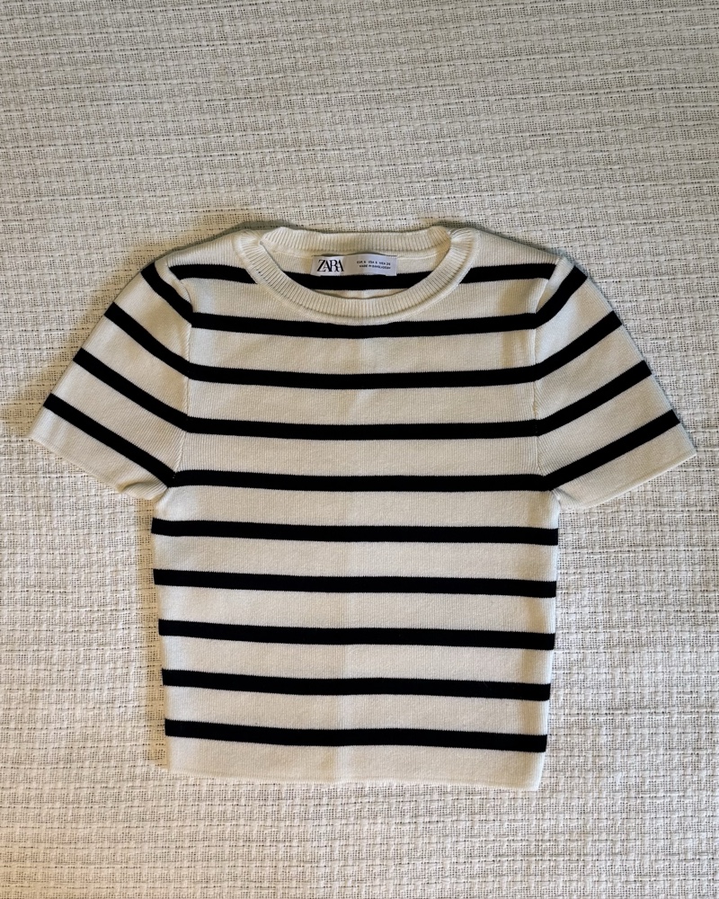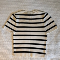 Pari kertaa käytössä ollut lyhyt raidallinen neule-t-paita.