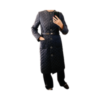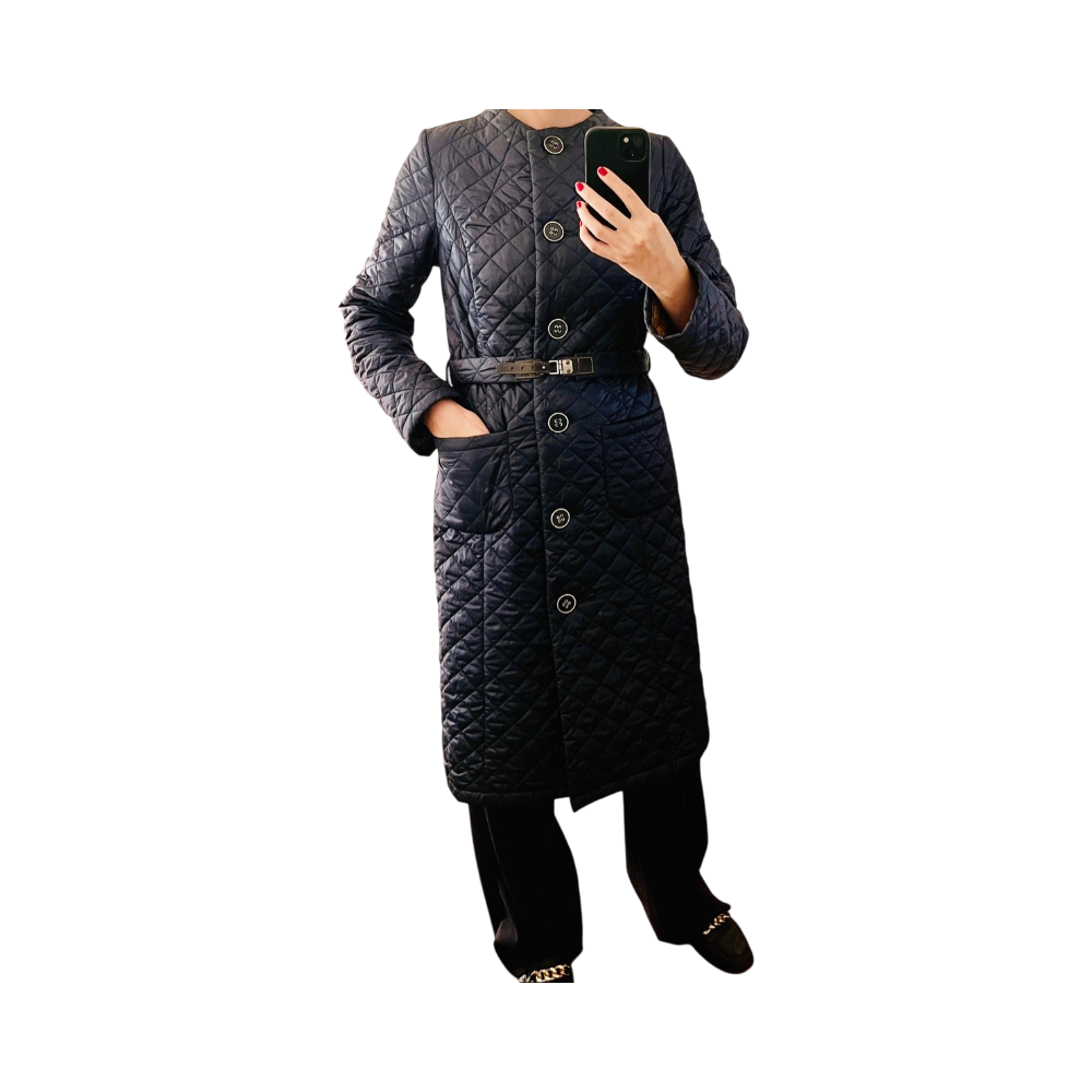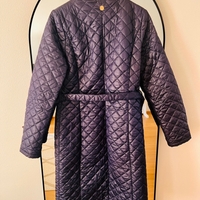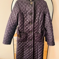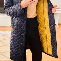 Tummansininen tikattu pitkä takki, keltainen vuori. Hyvässä kunnossa. Koko sopii 34/36.