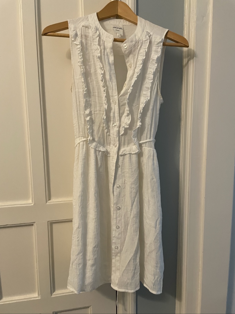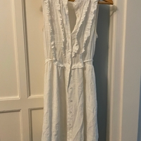 Lightweight ruffled button-front midi dress, tie waist, sleeveless.