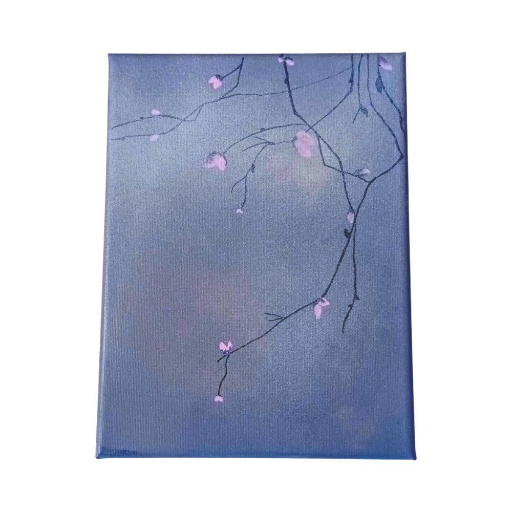 Akryylimaalaus sinisellä taustalla ja vaaleanpunaisia kukkia. N 20cm