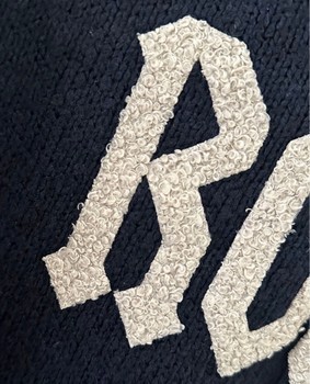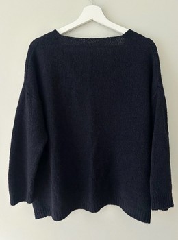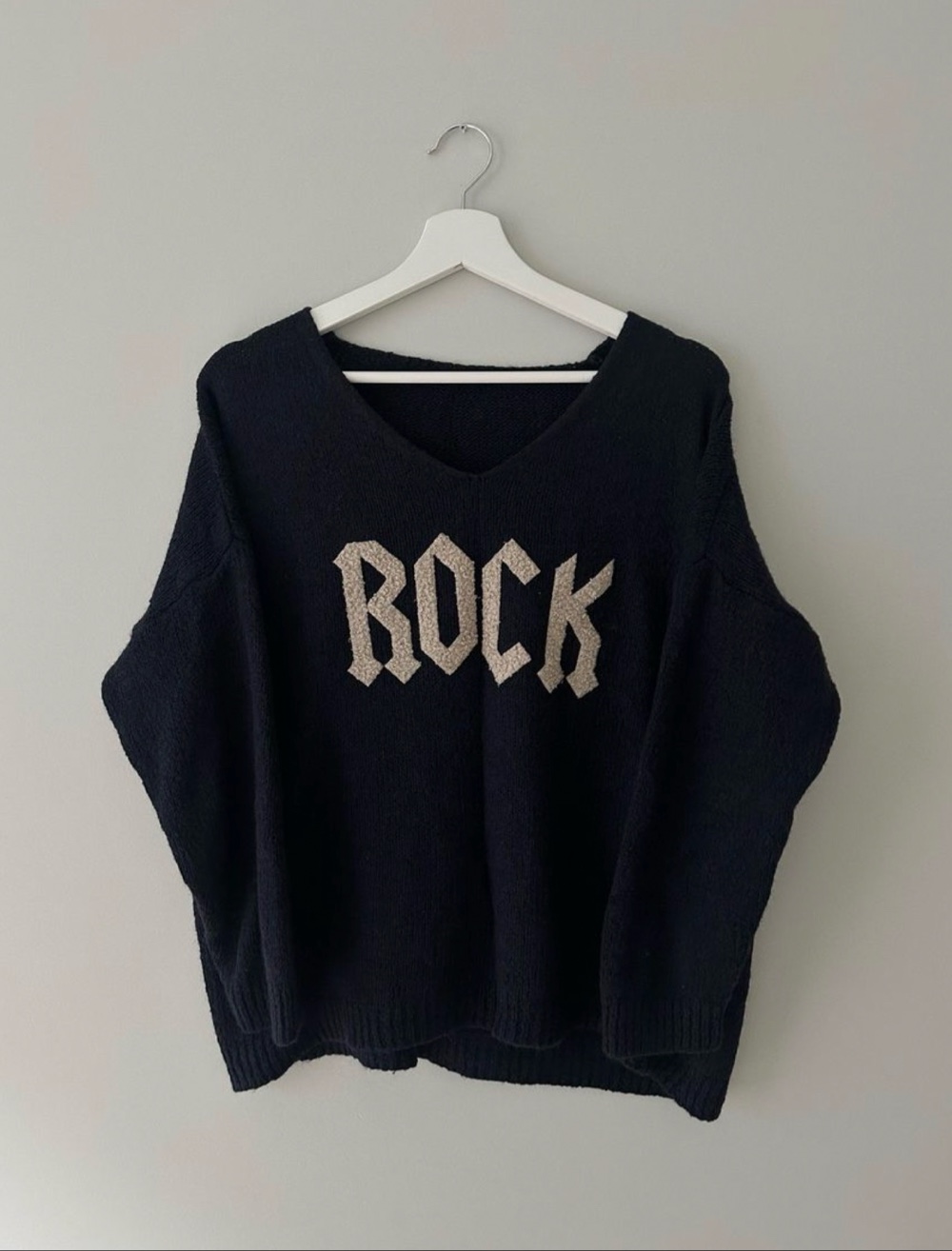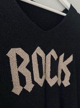 Black knit sweater with a textured beige ROCK appliqué on the front. Features a V-neckline.