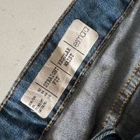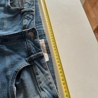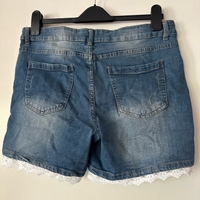 Naisten siniset farkkushortsit valkoisella pitsireunuksella. Koko 42, mutta kokoa pienemmät, mittoja kuvista.