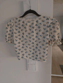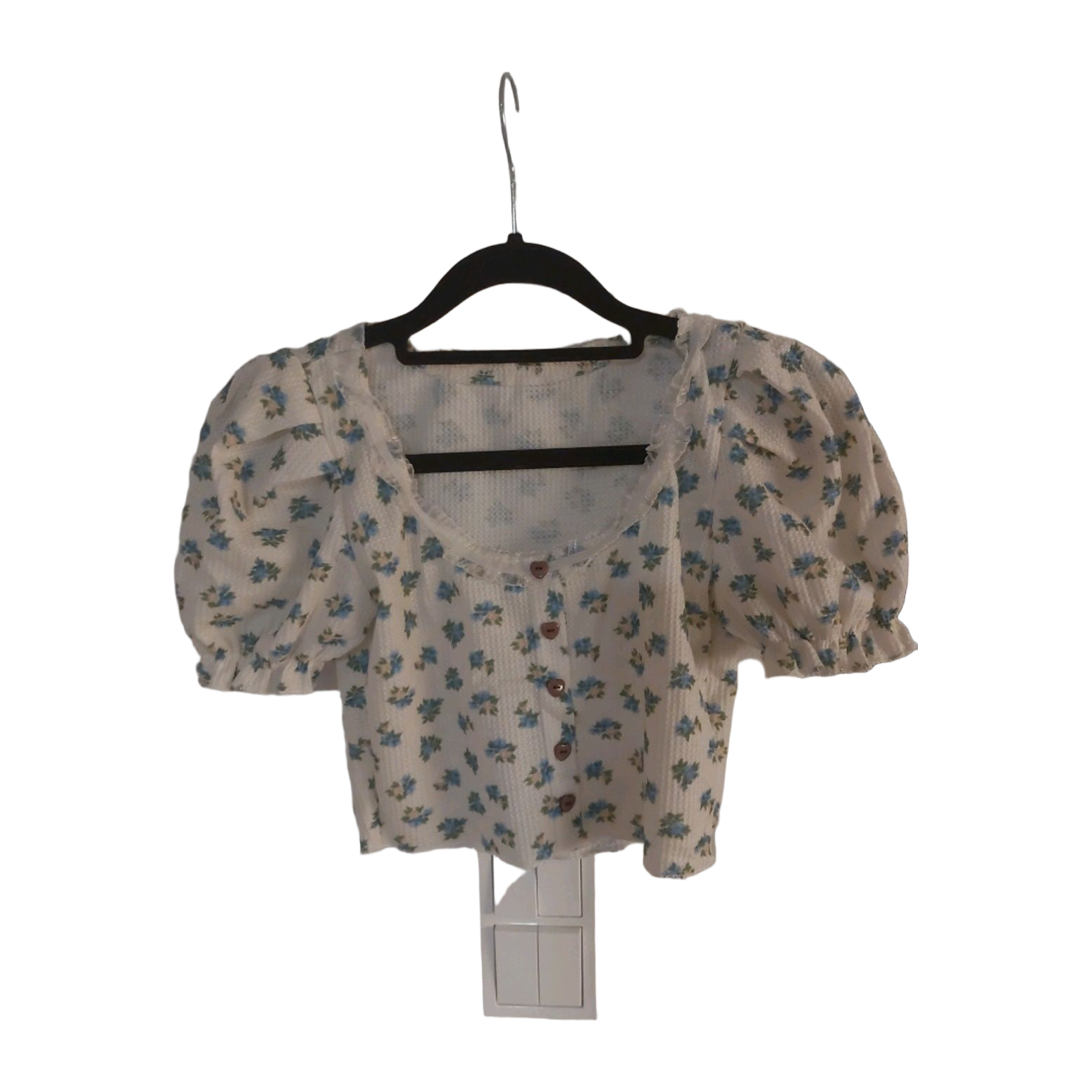 Cropped flower shirt with puffed sleeves.
