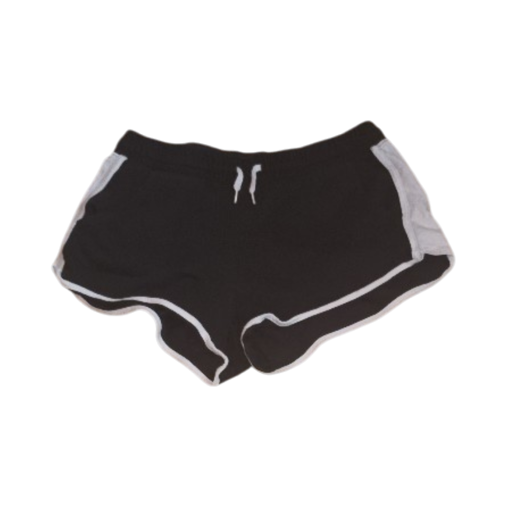 Lyhyet mustat shortsit valkoisilla reuna- ja sivuilloilla.