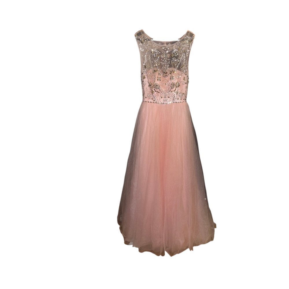 Pitkä tyllihame, strassikoristeltu, avonainen selkä. Sopii 160-170 pituiselle. Koko S