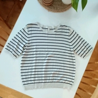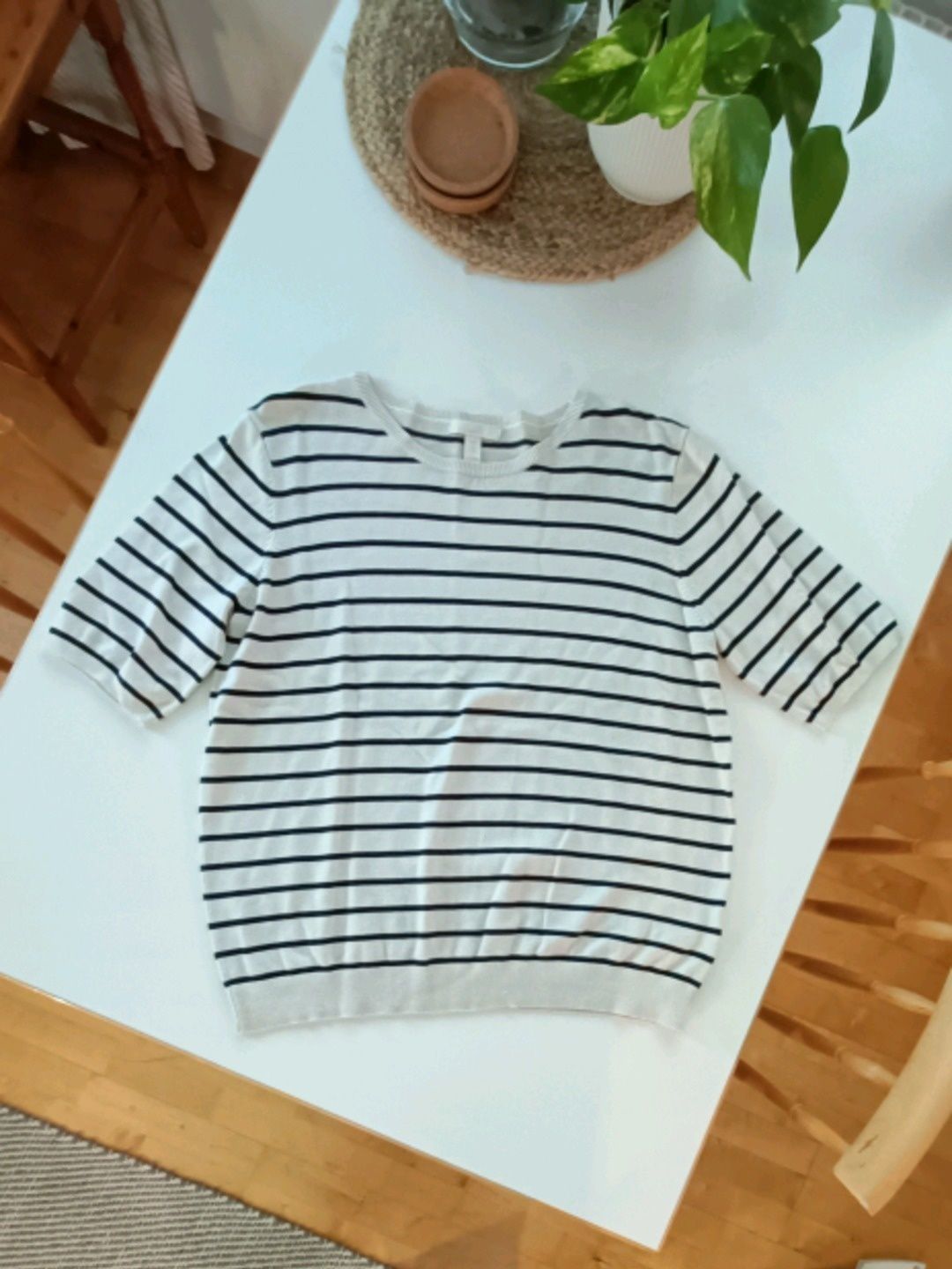 Mustavalkoinen lyhythihainen neulepaita. Koko L.