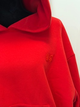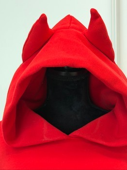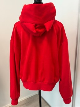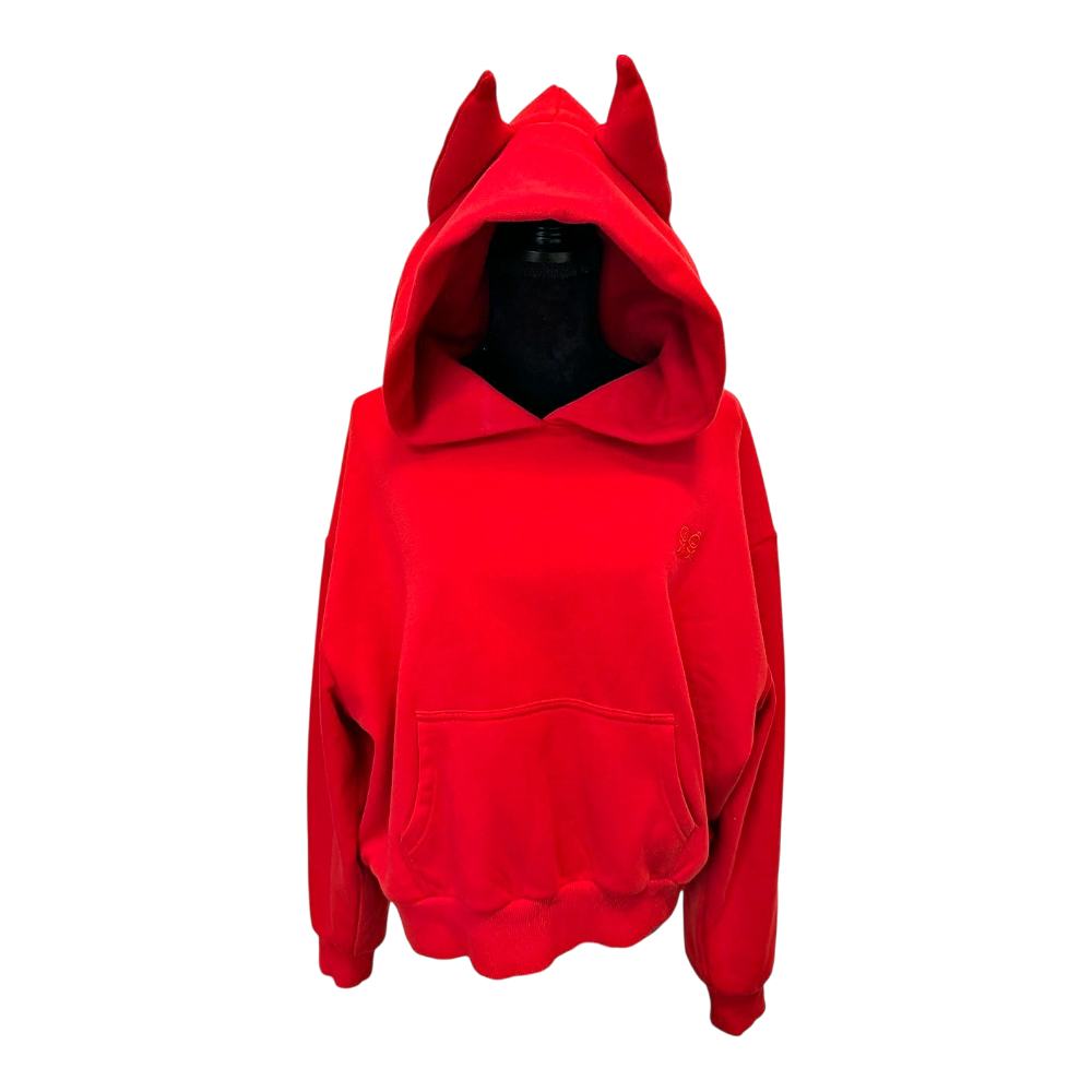 Red hooded sweatshirt featuring decorative horn details on the hood and a front kangaroo pocket.