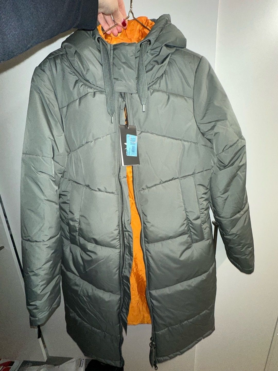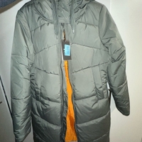 Täysin käyttämätön oliivin vihreä pitkä talvitakki, vegaaninen, ecoystävällinen. Loppuunmyyty.