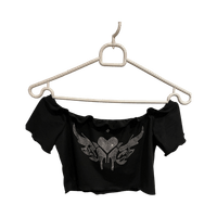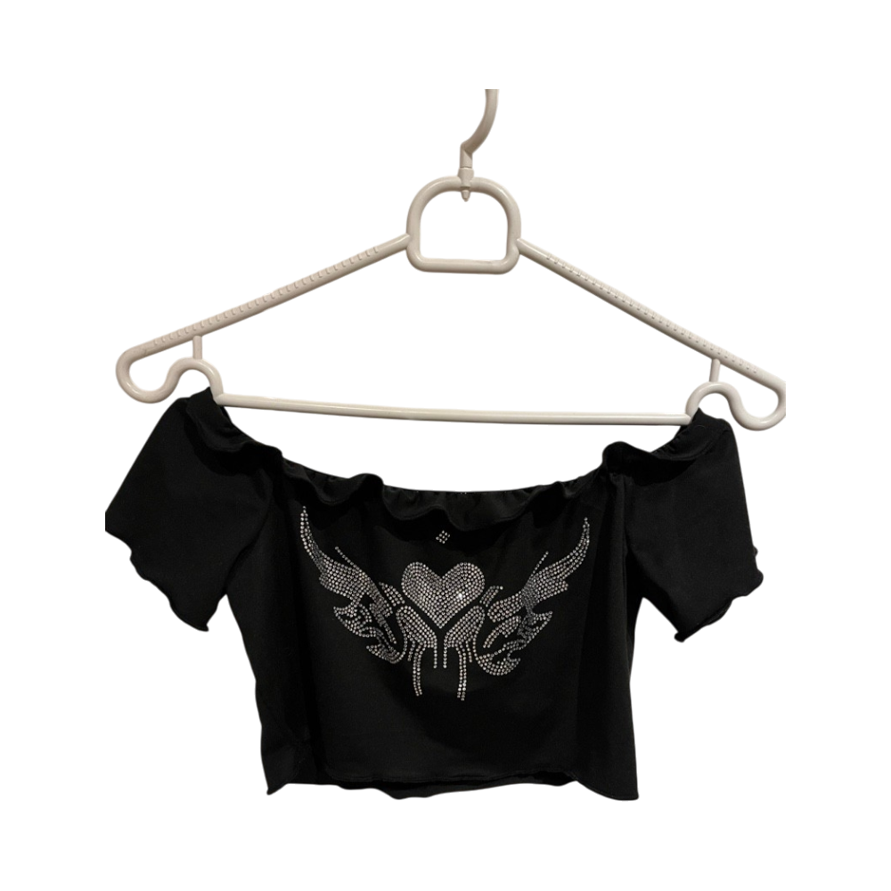 Lyhyt off-shoulder toppi strassikoristeilla. Muutama strassi lähtenyt irti, mutta tuskin huomaa