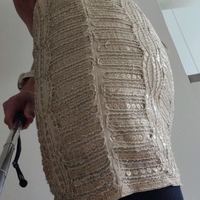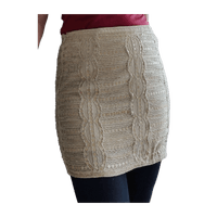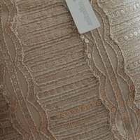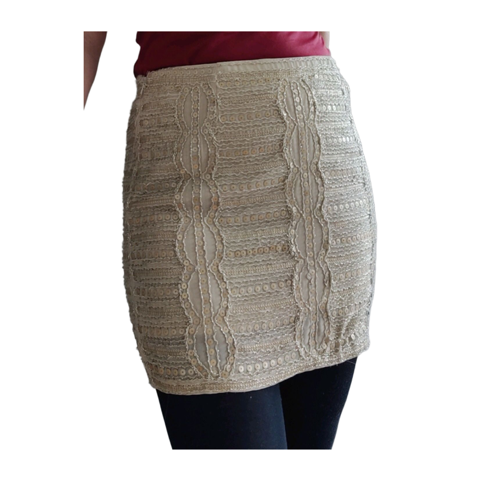 Juhlahame, kullanväriset paljetit ja helmikoristeita. Hameen pituus on 37 cm, tuotteessa ei ole kokomerkintää.
