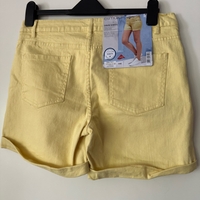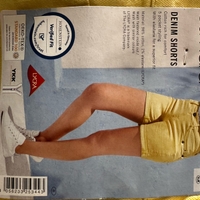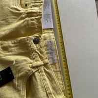 Keltaiset farkkumaiset shortsit. Koko 42, mutta ainakin kokoa pienemmät, mittoja kuvista.