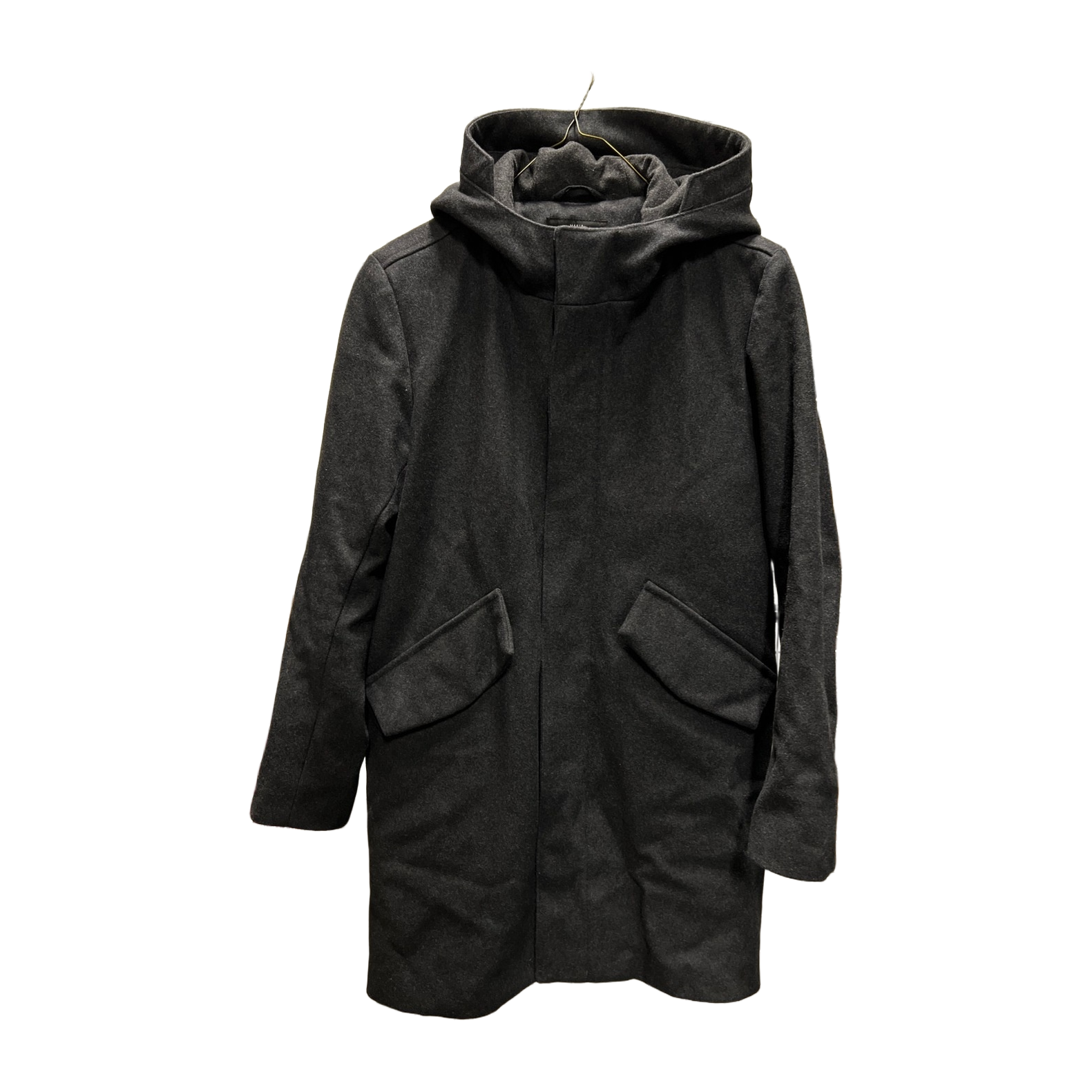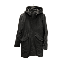 Wool coat in grey. Magnetic parts to secure pockets and along the zipper line. The warmest coat I have and it’s also quite elegant and convenient as the hood allows to be worn even in snow.