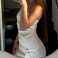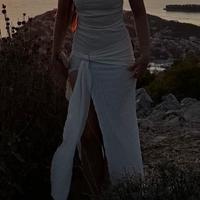 Pari kertaa käytössä ollut valkoinen/kermanvärinen kesämekko, jossa edessä korkea halkio. Materiaali on joustavaa, joten mekko menee S/M-kokoiselle.