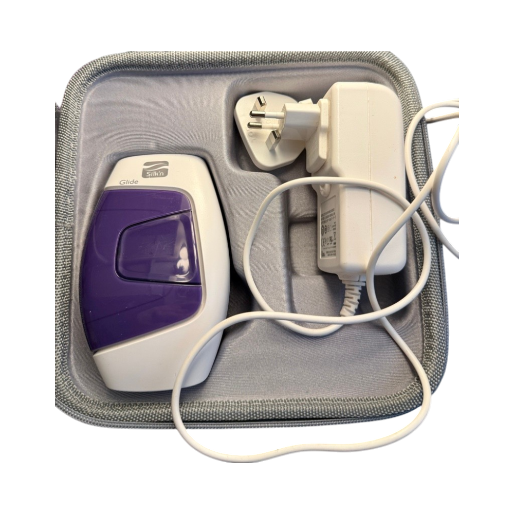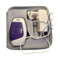 Koti-käyttöön tarkoitettu IPL/laser-karvanpoistolaite, mukana laturi.
