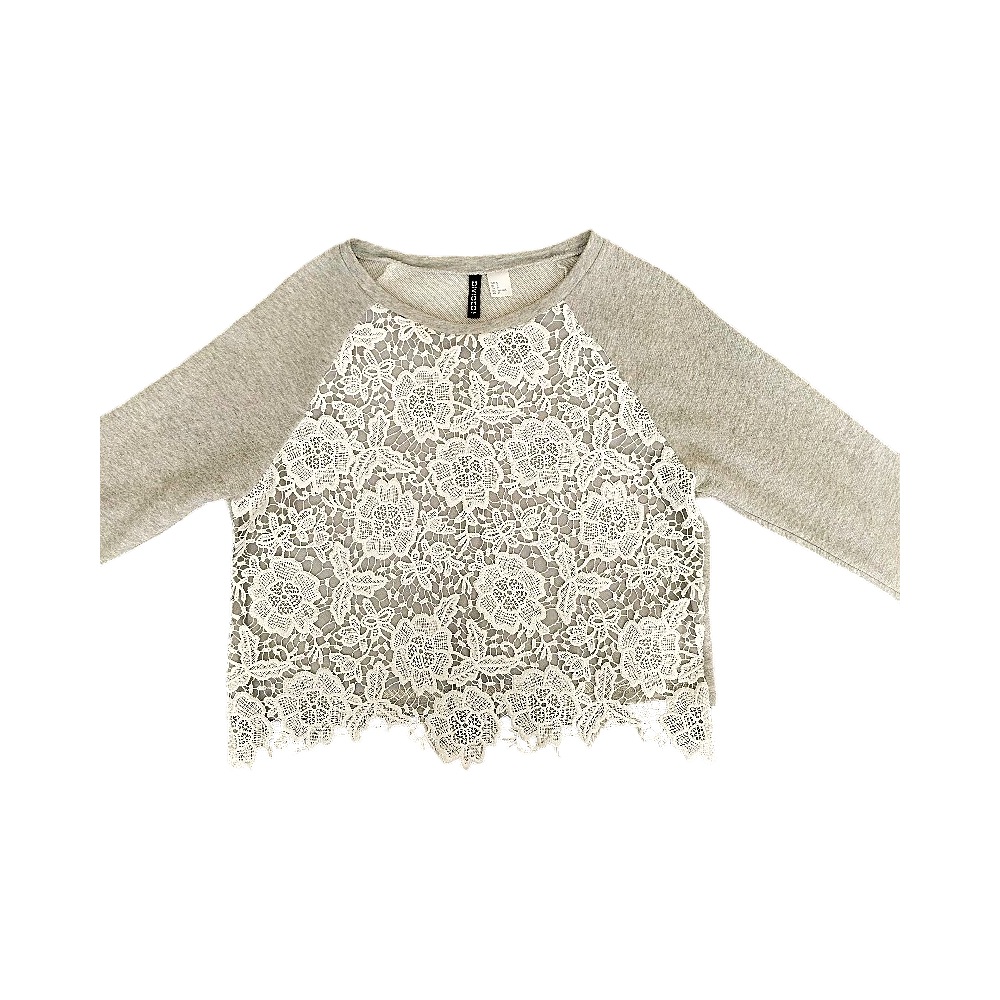 Rento harmaa paita valkoisella pitsikoristeella. 3/4 hihat, cropattu