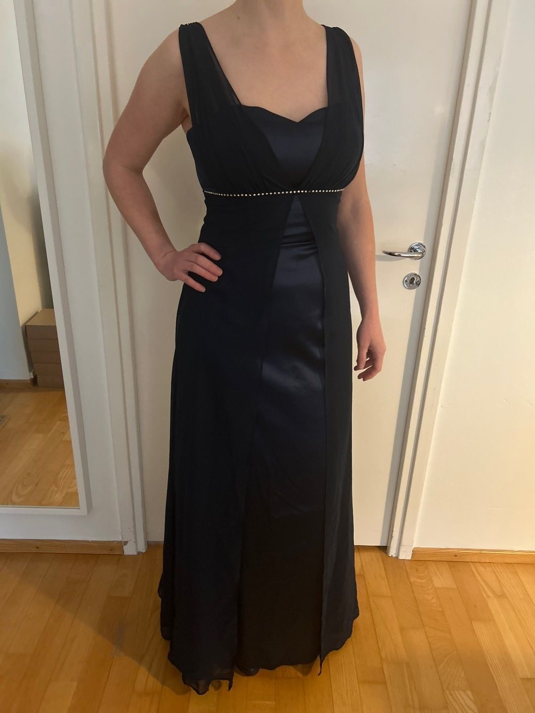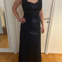 Klassinen tummansininen iltapuku, merkki Jora Collection. Materiaali 100% polyesteri.