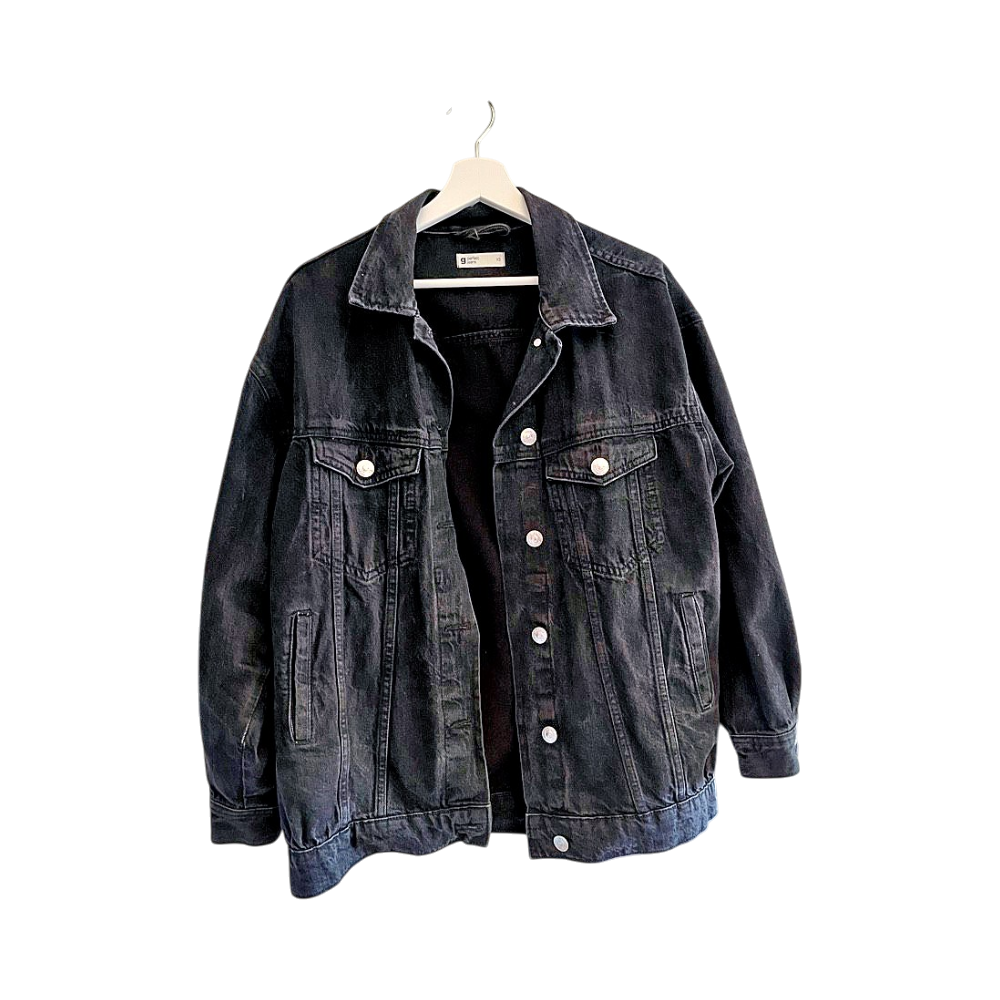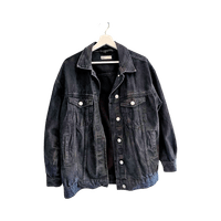 Musta/harmaa oversize farkkutakki, käytetty, hyväkuntoinen, napit edessä. Pientä kulumaa/käytön jälkiä on jotka näkyy kuvissa.