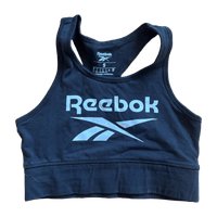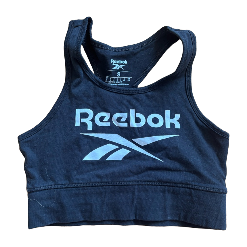 Black Reebok sports bra with racerback design, size small.