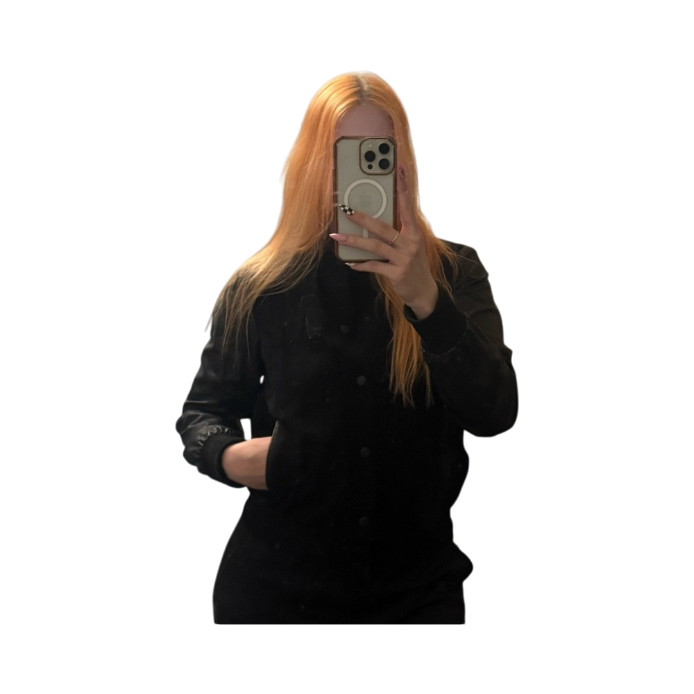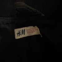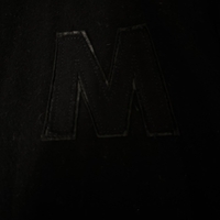 Musta villasekoitteinen takki, kirjainyksityiskohta. Etuosa villantyylistä kangasta, muuten nahkaa