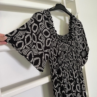 Mekko arkeen ja juhlaan! Midimekko smokkauksella ja väljillä hihoilla, mustavalkoinen kuosi, merkki Your Face.