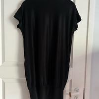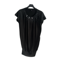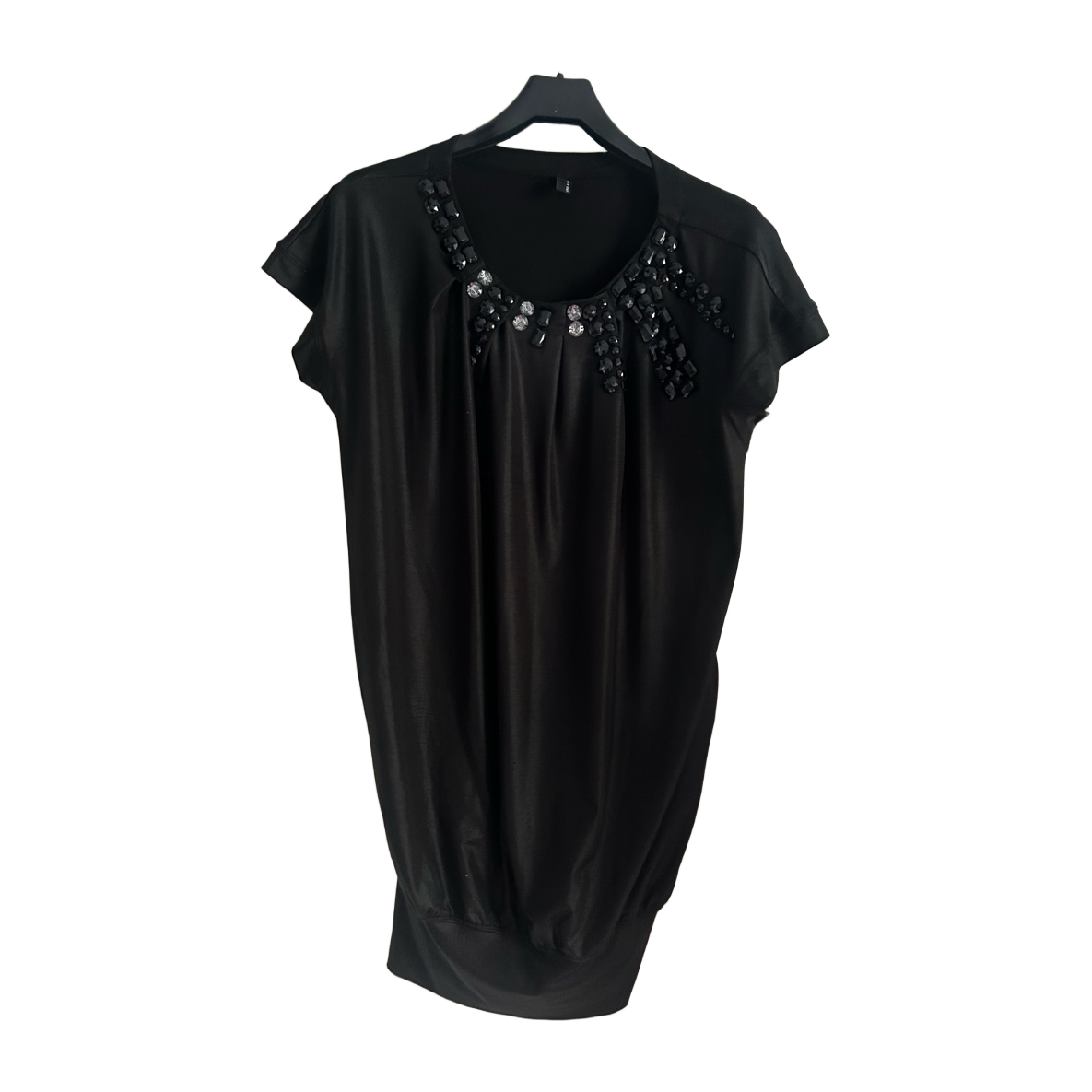 Musta lyhythihainen paita/mekko koristeellisella kaula-aukolla.