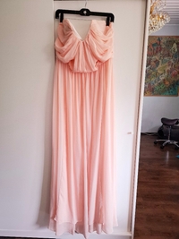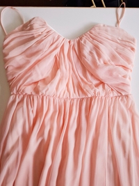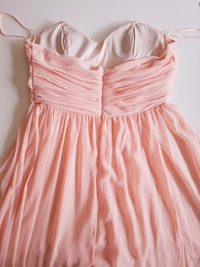 Elegant pink strapless evening dress with pleated sweetheart bodice detail and voluminous hem.