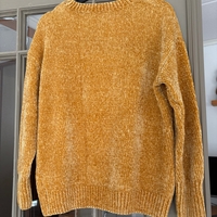 sinapinkeltainen neule, House Brand paita, samettimainen neule, syysneule, polyesteripaita, S-kokoinen paita, mukava neule, lämminsävyinen neule, sesonkiväri paita, pehmeä paita