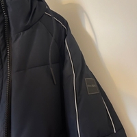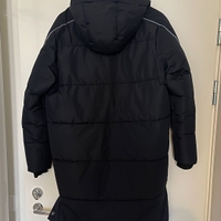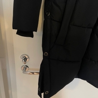 Raiskin hyväkuntoinen musta polvipituinen talvitakki. Hihoissa heijastinyksityiskohdat ja helmassa nappikiinnitykset. Koko reilu 36.