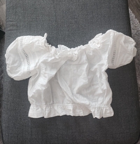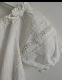 Valkoinen pusero röyhelöillä ja ilmavilla hihoilla.