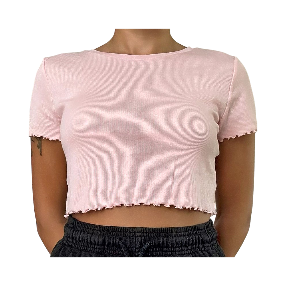Suloinen vaaleanpunainen ribattu crop top lyhyillä hihoilla ja aaltoilevalla helmalla. Koko XS/S, joustava materiaali. Sopii täydellisesti kesään, arkeen tai festareille farkkujen, hameen tai shortsien kanssa. Hyväkuntoinen.