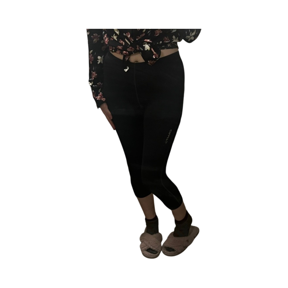 Mustat tekniset capri-housut, korkeavyötäröiset ja joustavat.