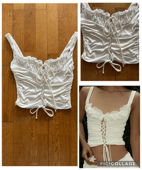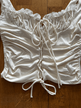 Korsettityylinen pitsireunainen toppi, nyöritys edessä.