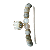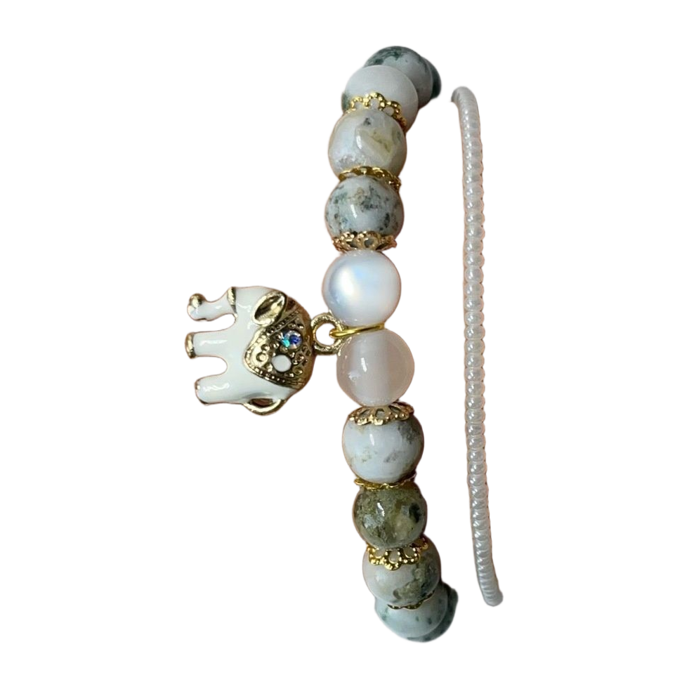 Käsintehty rannekoru puuakaatti luonnonkivihelmistä ja muutamasta lasihelmestä. Norsu -riipus lisäkoristeena.