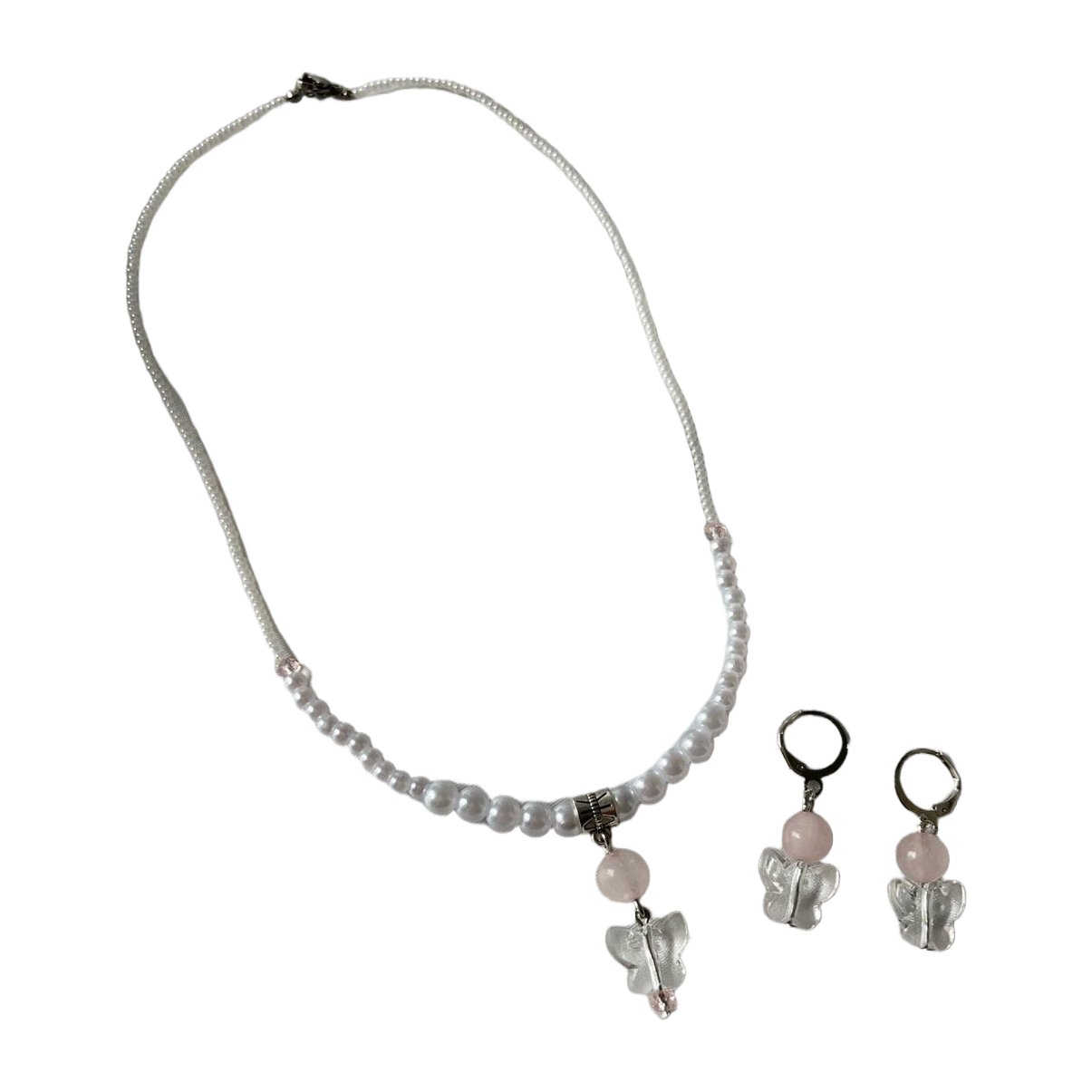 #necklace #kaulakoru #earrings #korvakorut #handmade #käsintehty #butterfly #perhonen #rosequartz #ruusukvartsi