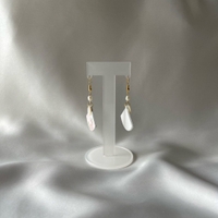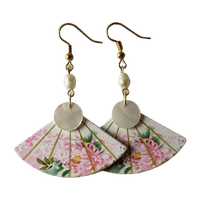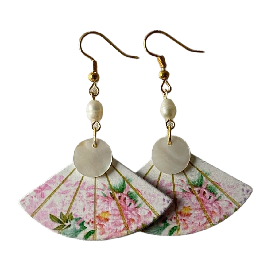Käsintehdyt puiset viuhka korvakorut, makeanvedenhelmillä sekä simpukankuorilla.